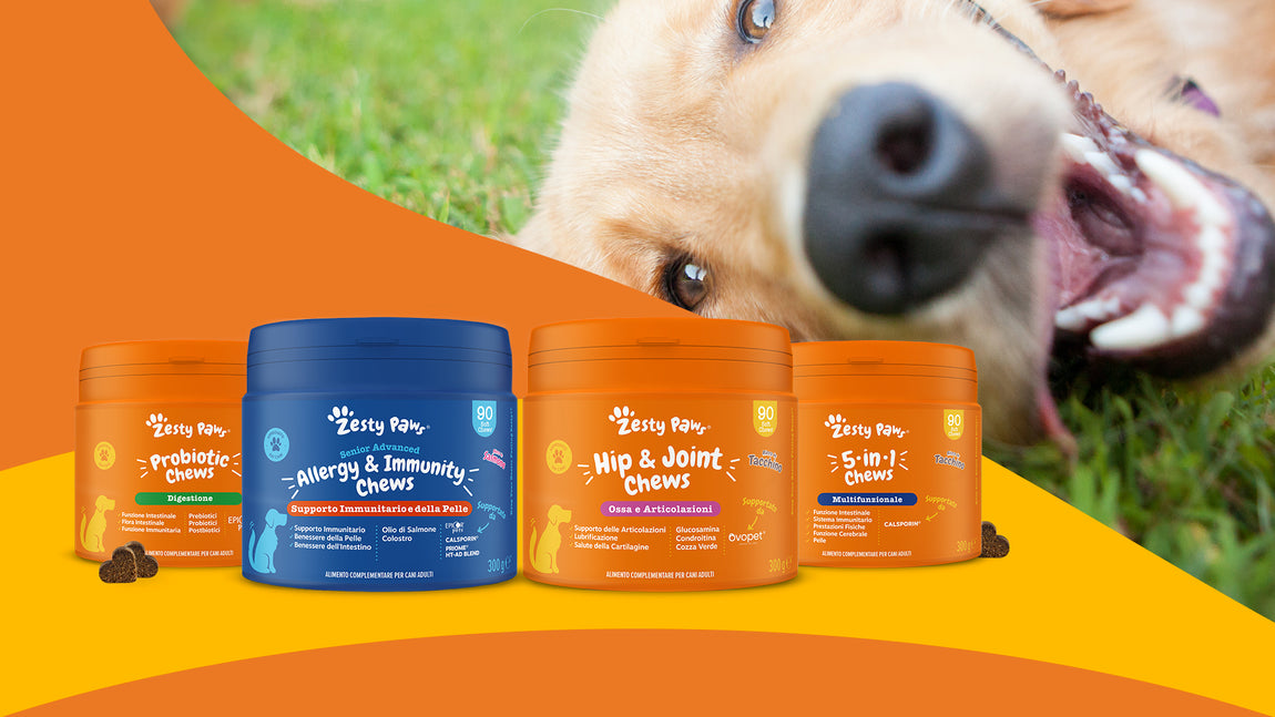 Acquista e ricevi Zesty Paws a casa tua. Tutta la nostra gamma prodotti è attualmente disponibile su Amazon e Zooplus.